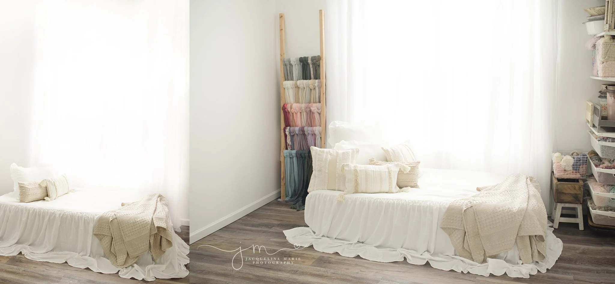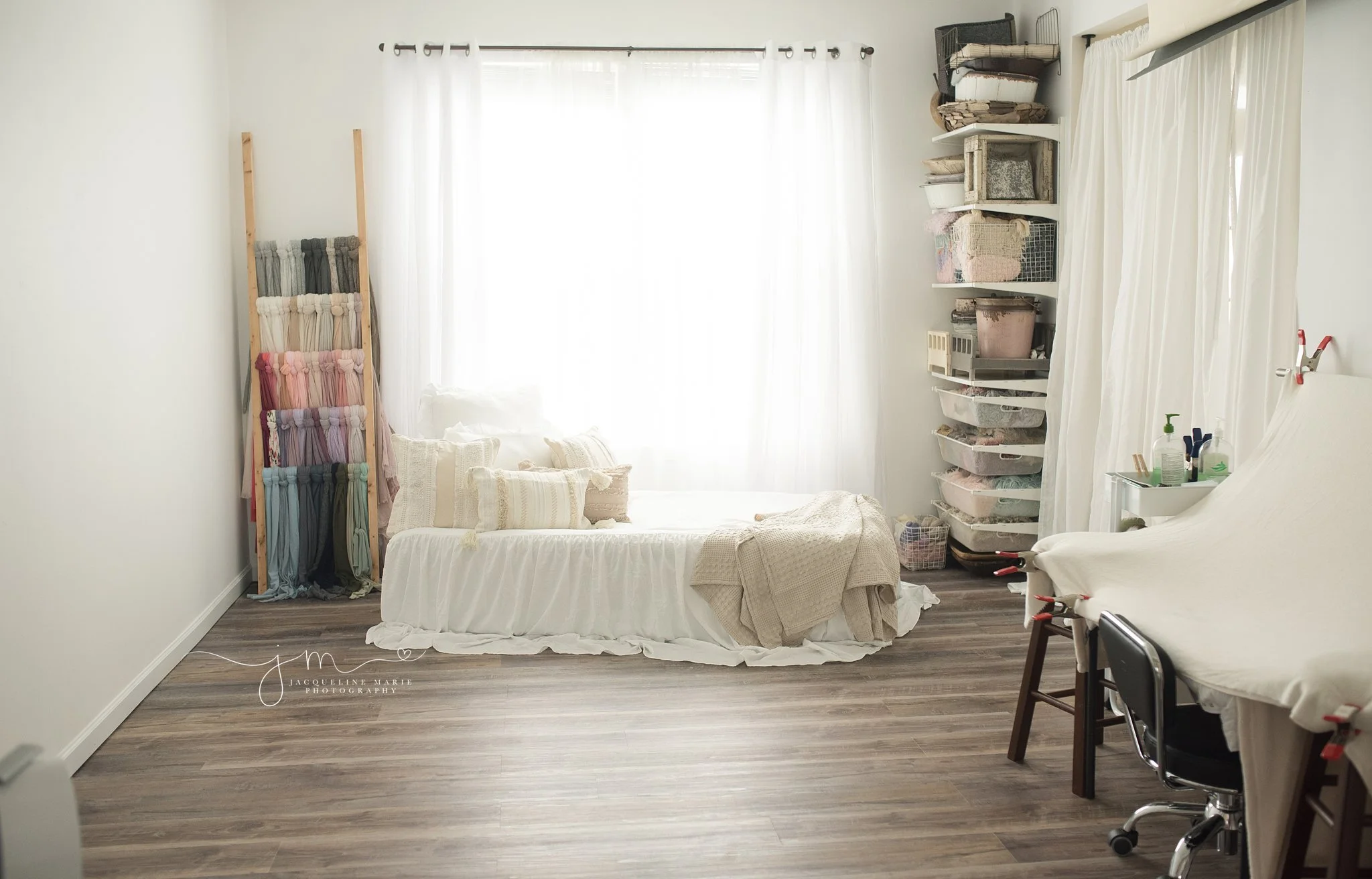 My studio is full of soft pastel and neutral colors. I offer many choices for your newborn and milestone sessions, including a full studio wardrobe for you little one up to size 12 months for babies. My studio has a new lifestyle bed setup with beautiful natural light to provide you with the most gorgeous images. I shoot with studio lighting as well to give the best results and produce those beautiful and timeless images you're wanting.